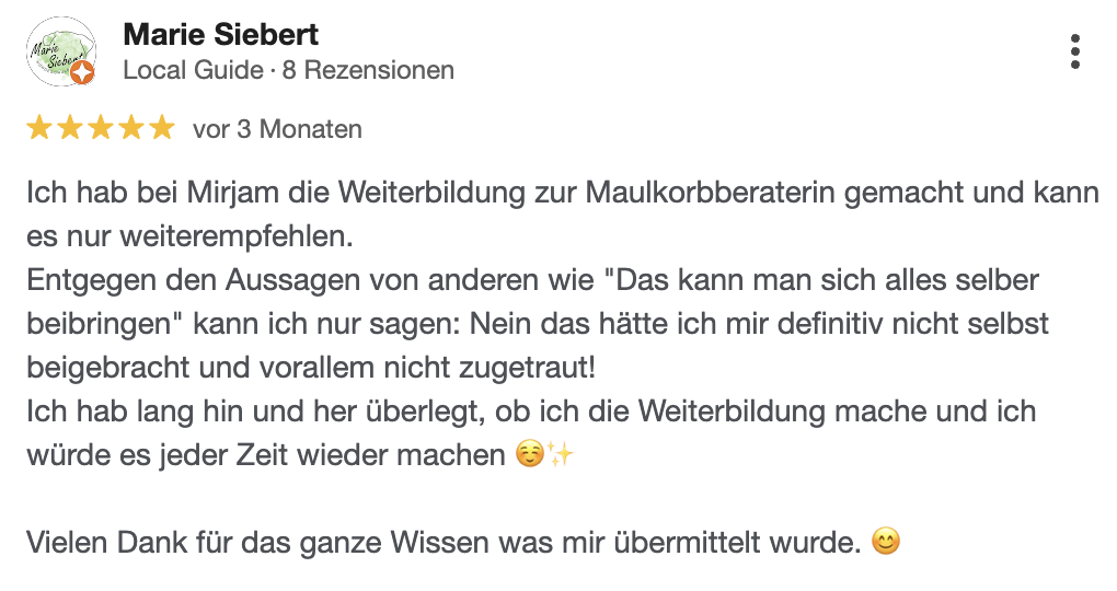 Seit 2024 biete ich Theorie-Webinare und Praxis-Workshops für Maulkorb-Berater an, weil es einfach zu wenige gibt. Weil so eine kurze Zeit aber nicht reicht, machen Freya und ich jetzt diese geniale Weiterbildung zusammen.